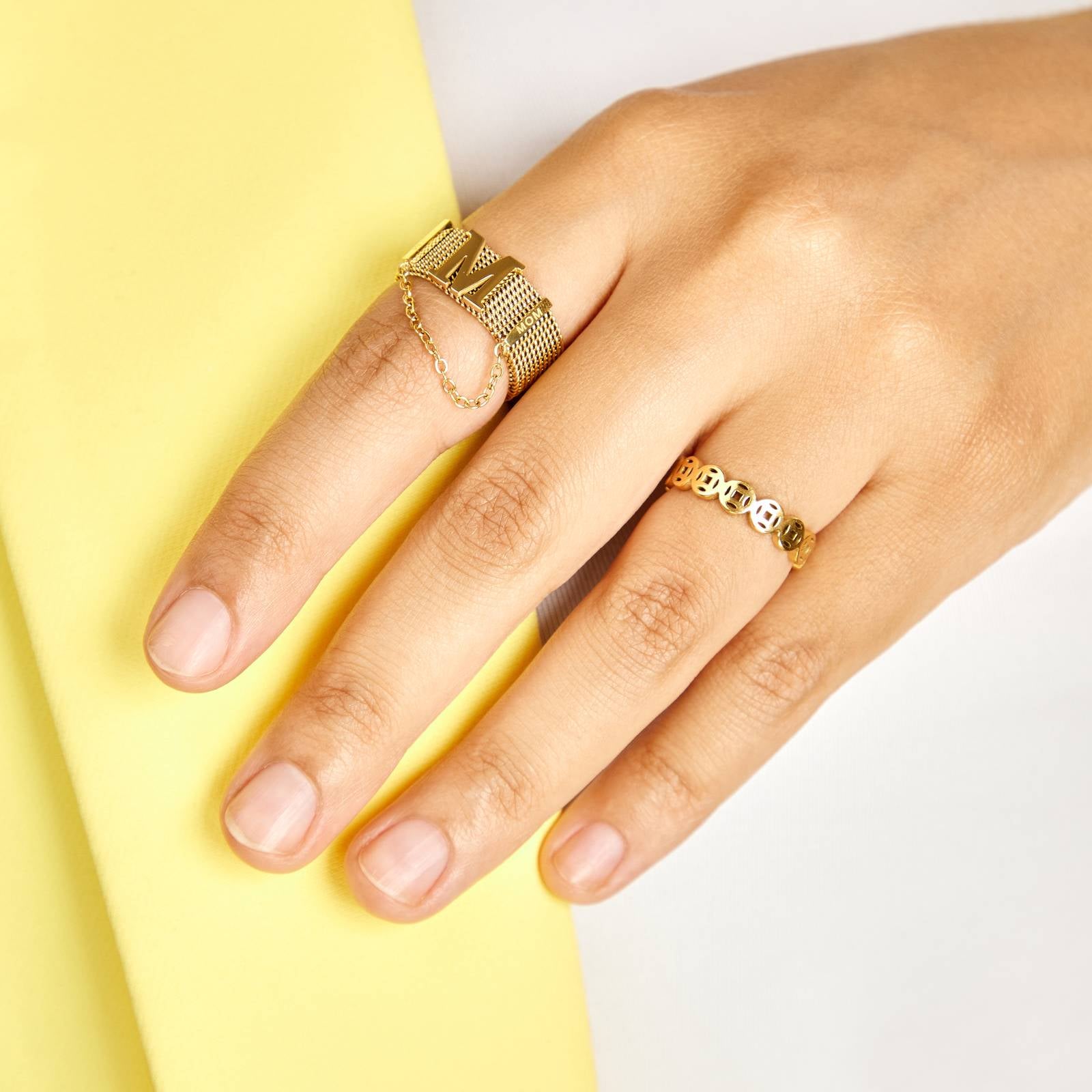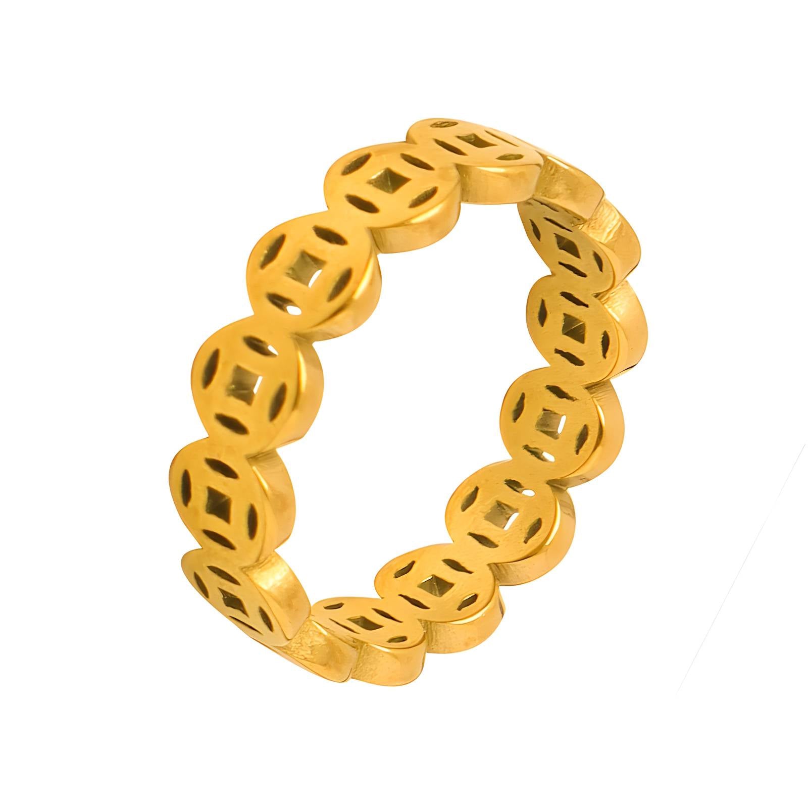 This Stainless Steel Maeve Lucky Coin Ring is a must-have in your fashion accessory collection. The perfect blend of gold plating and stainless steel makes this ring a standout piece.