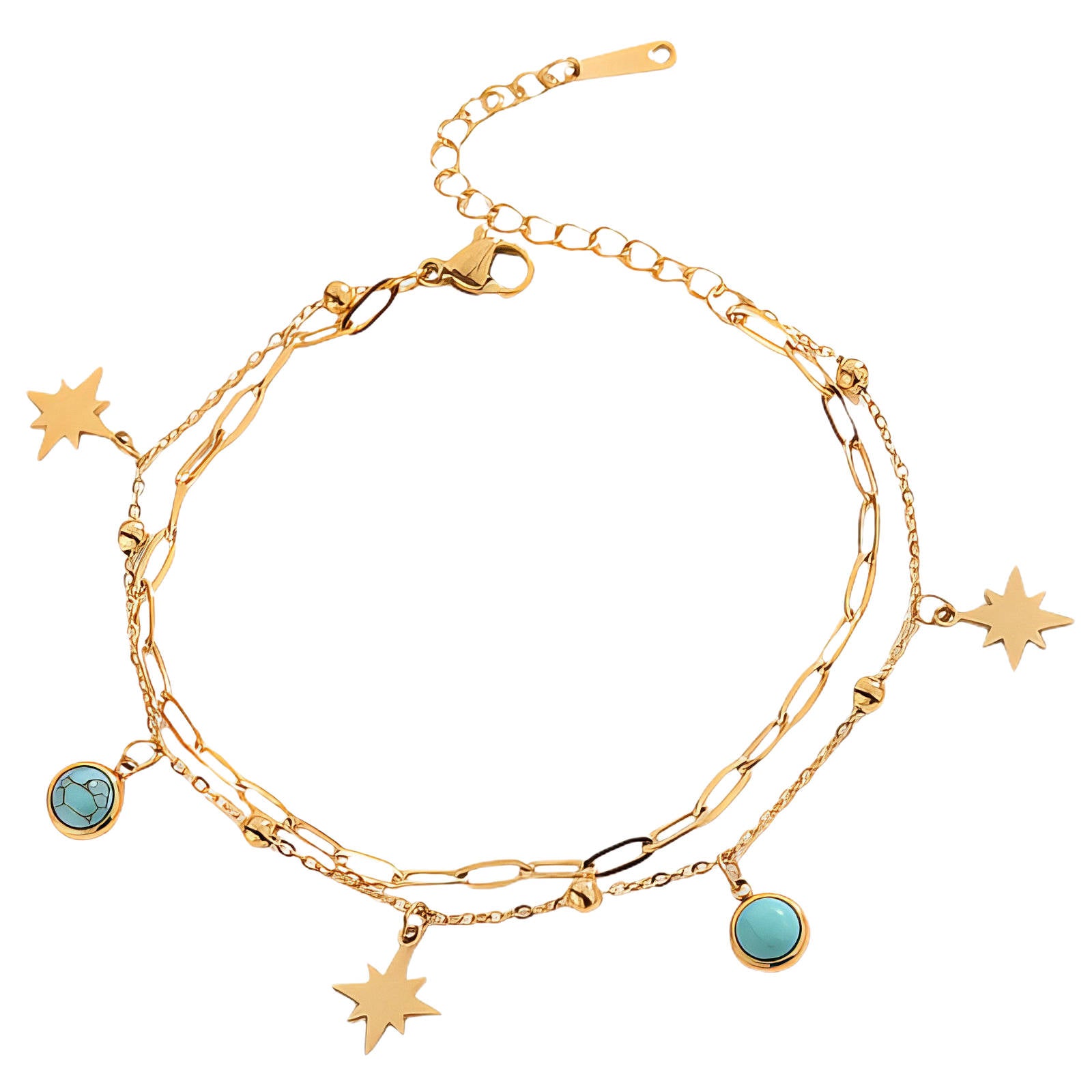 Let your style shine with the Turquoise Sky Bracelet – a dreamy celestial piece with a pop of colour. This layered bracelet combines dainty gold chains with star charms and turquoise-toned accents for a look that's both playful and elegant.